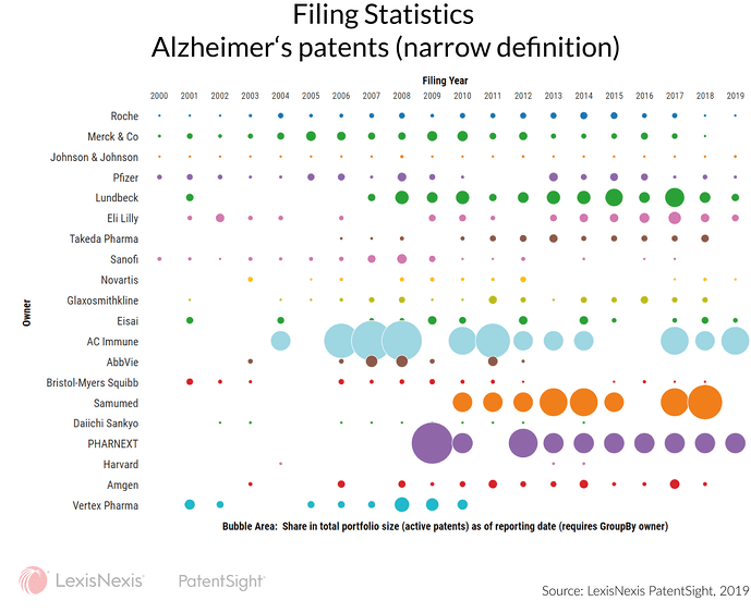 Such a look at the filing statistics, as shown in figure 2, of the top companies within a broadly defined research area, where AD can be any one of the many enlisted targeted diseases, already starts to give us an idea about the companies that have or are one the verge of giving up the righteous fight.