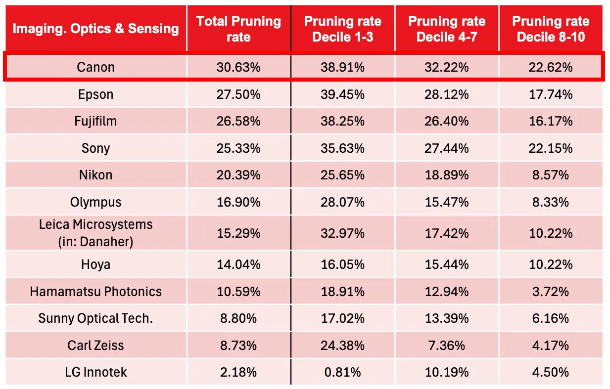 While the industry-wide average pruning rate sits at just over 17%, behavior varies substantially across companies. Canon stands out as the most active pruner, reducing its portfolio by more than 30% over the period analyzed. At the other end of the spectrum, LG Innotek shows minimal pruning, discontinuing just over 2% of its active patent families. Between these extremes, companies such as Epson, Fujifilm, and Sony exhibit pruning rates in the mid-20% range. Nikon and Olympus show more moderate reductions. These differences reflect a mix of portfolio age profiles, geographic strategies, and business models rather than a single optimal pruning rate. Nonetheless, the variation highlights the extent to which pruning practices remain uneven across the sector.