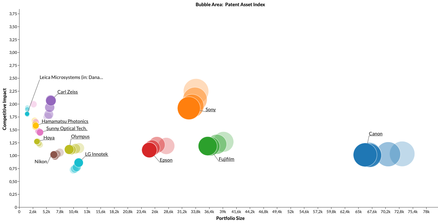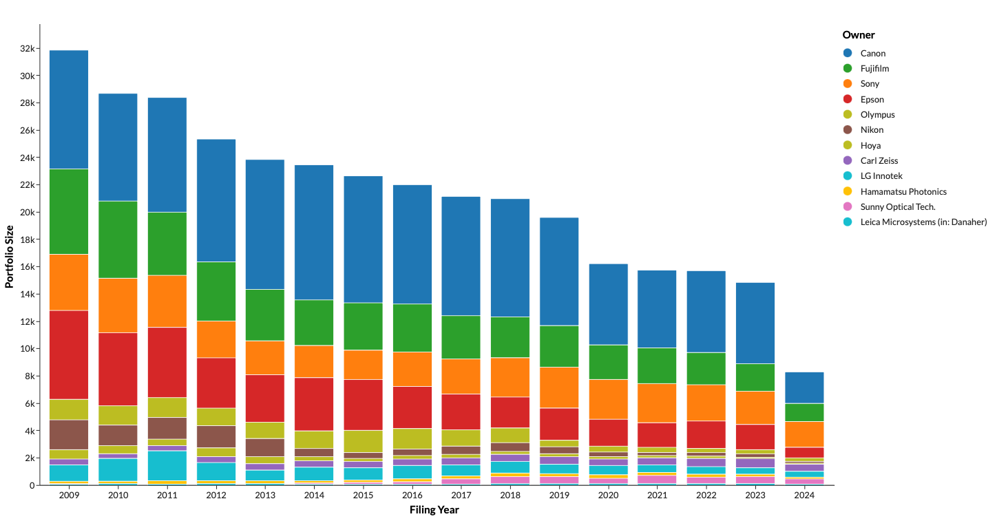 Capturing images and taking photos has become an almost everyday activity for most people, whether through smartphones, cameras or a growing range of connected devices. Behind this familiar practice sits a complex ecosystem of optical, imaging, and sensing technologies that enable image capture, processing, and interpretation across consumer, industrial, and professional applications. While often taken for granted, these technologies underpin products and systems used in areas ranging from consumer electronics and manufacturing to healthcare, mobility, and automated inspection. The technologies behind these everyday applications are reflected in extensive and diverse patent portfolios held by companies operating across the optics, imaging, and sensing value chain. To provide a structured view of patent portfolios and pruning behavior in this sector, this analysis focuses on 12 leading companies – Canon, Fujifilm, Epson, Sony, Nikon, Olympus, Carl Zeiss, Leica Microsystems, Hoya, Hamamatsu Photonics, LG Innotek and Sunny Optical Technology. Together they maintain more than 206,000 active patent families worldwide. Their portfolios span a broad range of technology clusters, from optics and photography, to electrography and printing, as well as television systems, and image capture and output, as illustrated in the portfolio-size distribution across technology clusters.