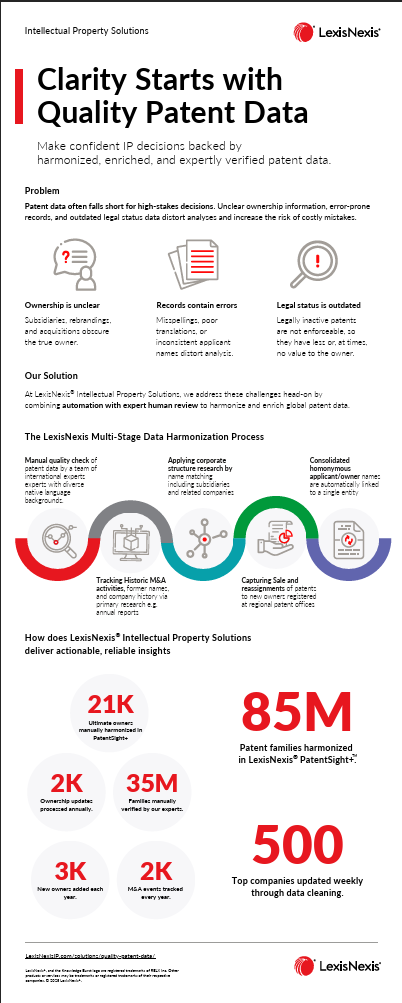 Home > IP Solutions > Quality Patent Data Get Reliable IP Insights Through Clean, Trusted Patent Data Ensure confident, data-driven decisions with LexisNexis® Intellectual Property Solutions. Challenges our approach Impact Solutions FAQs Get in touch The Challenges of Patent Data Quality Patent data is publicly available from 100+ authorities worldwide, but raw datasets often contain critical errors: Incomplete ownership information Subsidiaries, historic names, or inventors often appear in place of the true ultimate owner, hiding the real competitive landscape. Ambiguous legal status Patents may lapse, be reassigned, or invalidated long before their 20-year term, making it unclear who truly controls the rights. Name variations and translation errors Misspellings, transliterations, and homonyms lead to fragmented or duplicated ownership records. Relying on unharmonized data can result in misjudged valuations, flawed benchmarks, and billion-dollar missteps. How LexisNexis Intellectual Property Solutions Ensures Data Quality Our multi‑stage harmonization combines automation with expert human review to deliver trusted patent ownership data you can act on. Watch how harmonization maps true ownership across jurisdictions and time. Clarity Starts With Quality Patent Data Global scale with local expertise – A dedicated team of 11 specialists across 3 countries, fluent in English, Chinese, Japanese, Korean, and German, verify data accuracy with deep local knowledge. Breadth and depth – All 92 million patent families in PatentSight+ (Data as of Oct 2025) are automatically harmonized, with 35 million manually verified for ownership accuracy. Trusted coverage – Data sourced from 109+ global authorities and updated continuously, including daily court data and weekly harmonization of the top 500 companies. Corporate ownership clarity – Over 21,000 ultimate owners have been manually harmonized, with 3,000 new ones added annually and 2,000 ownership updates tracked each year. M&A and reassignment monitoring – Up to 2,000 M&A events per year are tracked, ensuring patent transfers are reflected in near real-time. Data Quality Snapshot: Ensuring Reliable Patent Analytics Get a one-page overview of how LexisNexis® harmonizes patent data across 92M families, 21K ultimate owners, and 109+ authorities—backed by expert verification and continuous updates. Download The Infographic What We Harmonize Every inconsistency in patent records can distort analytics, due diligence, and strategic decisions. Our process ensures: Subsidiaries to Parent Companies Patents filed under subsidiaries are linked back to the ultimate headquarters, so benchmarking reflects the true corporate owner. Historical Company Names Name changes and legacy brands are reconciled, so portfolios remain accurate across decades. Mergers & Acquisitions Both historic and ongoing M&A events are captured in real time, ensuring ownership is always correctly attributed. Patent Transactions Sales and reassignments are tracked continuously, keeping portfolios aligned with the current rights holder. Misspellings and Variations Inconsistencies across patent office records are standardized, reducing false positives and data fragmentation. Homonyms and Translations Same names are used by multiple distinct companies and universities. Download the 2025 Patent Data Quality Handbook Bad patent data leads to bad decisions. When company names are misspelled, ownerships misattributed, or acquisitions missed, entire R&D priorities, investments and partnerships can go off course. Our patent data quality handbook explains how LexisNexis rebuilds trust in patent data through meticulous global data harmonization—turning fragmented records into structured data that leaders can act on with confidence. Read now Why It Matters Patent analytics is only as strong as the data behind it. Clean, harmonized data empowers you to: Benchmark portfolios with confidence Detect competitors and new entrants accurately Identify litigation risks and enforcement patterns Support high-stakes decisions in M&A, licensing, and strategy Earn confidence in the boardroom Trusted Data for High-Stakes Decisions Put audit‑ready IP metrics in front of executives and investors. The same harmonized datasets that power our platforms also support boardroom discussions, investor communications, and regulatory filings, so results are transparent, explainable, and defensible when the stakes are highest. Our verification spans ultimate ownership, legal status, and standardized bibliographic fields, backed by large‑scale automation and expert curation. The same trusted data that underpins our platforms is used in litigation, licensing negotiations, and regulatory disclosures. It is auditable, transparent, and defensible—giving leaders the confidence to rely on it in investor communications, sustainability reports, and executive decision-making. See how companies are bringing IP into the boardroom with trusted LexisNexis® data Explore how leaders bring IP to the boardroom Explore how trusted IP data builds confidence in the boardroom: IP Analytics & IntelligenceMetrics for Investors: Elevate Your IR StrategyRead more IP Analytics & IntelligenceHow Leading Innovators Use IP Data to Build Investor TrustRead more IP Analytics & IntelligenceExecutive Insights from IP Analytics Boost ESG and Investor TrustRead more “Our company does regular benchmarking against competitors. By using PatentSight, we save more than two man-years per year just for applicant data cleaning.” – PatentSight+ Customer at a A multinational health technology company What We Offer — Turn Data Into Action IP Intelligence Software Turn complex patent data into clarity with platforms like PatentSight+ and IPlytics. Analyze technologies, track competitors, and translate insights into strategies executives understand. Explore Software IP Data Access Bring harmonized global patent, ownership, and standards data dire